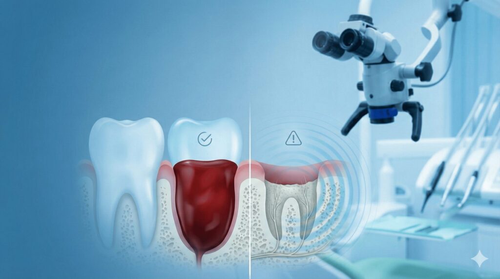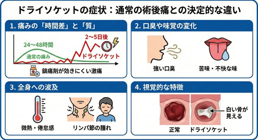 ドライソケットの最大の特徴は、その痛みの「現れ方」です。 通常の抜歯後の痛みは、麻酔が切れた直後から始まり、24〜48時間以内にピークを迎え、その後は徐々に軽減していきます。 しかし、ドライソケットの場合は「時間差」があります。抜歯から2〜5日ほど経過し、炎症が引いてくるはずのタイミングで痛みがぶり返し、以前よりも激しくなるのが典型的なパターンです。