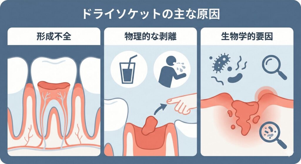口腔内の衛生状態が悪く、特定の細菌(線維素溶解酵素を出す菌)が増殖していると、化学的に血餅を溶かしてしまうことがあります。また、難しい抜歯で骨に過度な負担(侵襲)がかかった場合も、組織の治癒能力が低下し発生しやすくなります。