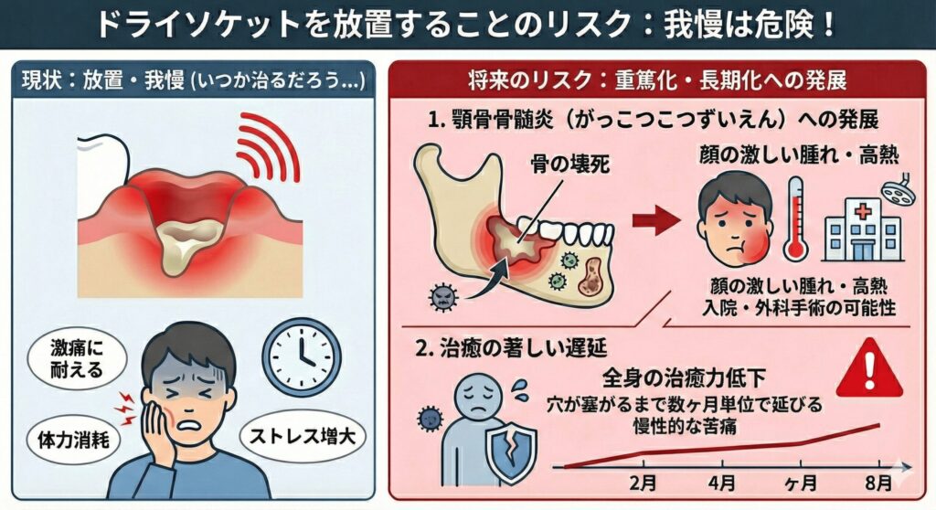 骨が露出した状態は、細菌が骨の内部(骨髄)に侵入しやすい状態です。ここから重篤な感染症である「顎骨骨髄炎」に移行すると、顔の激しい腫れや高熱、最悪の場合は骨の壊死を招き、入院や外科手術が必要になることがあります。
