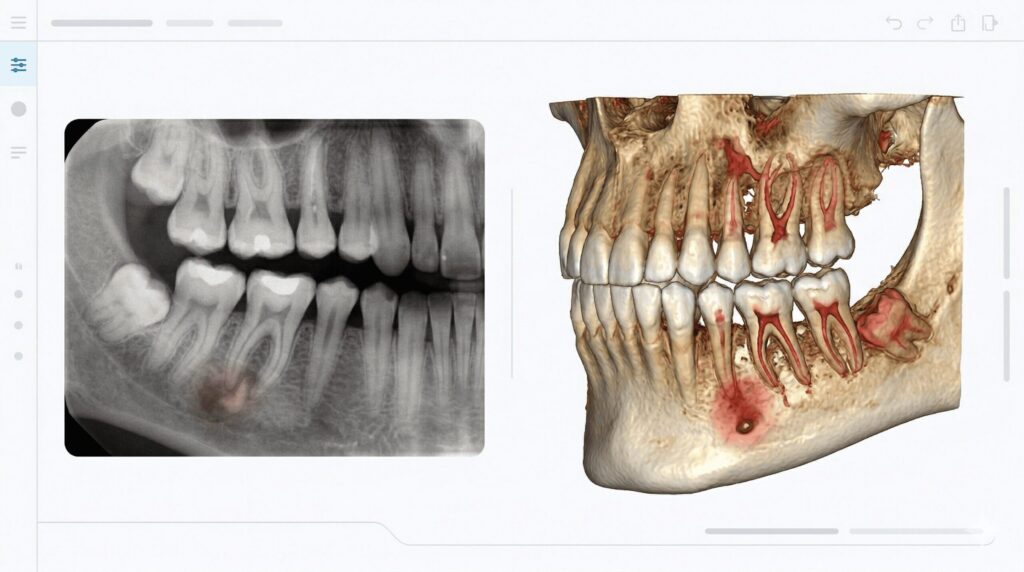 CBCT(歯科用CT)を用いた3次元診断は、治療計画を立てるうえで重要な役割を果たします。従来の2次元レントゲンでは、歯の根の分岐や複雑な曲がり、隠れた病変などが重なって見えにくく、診断に限界がありました。