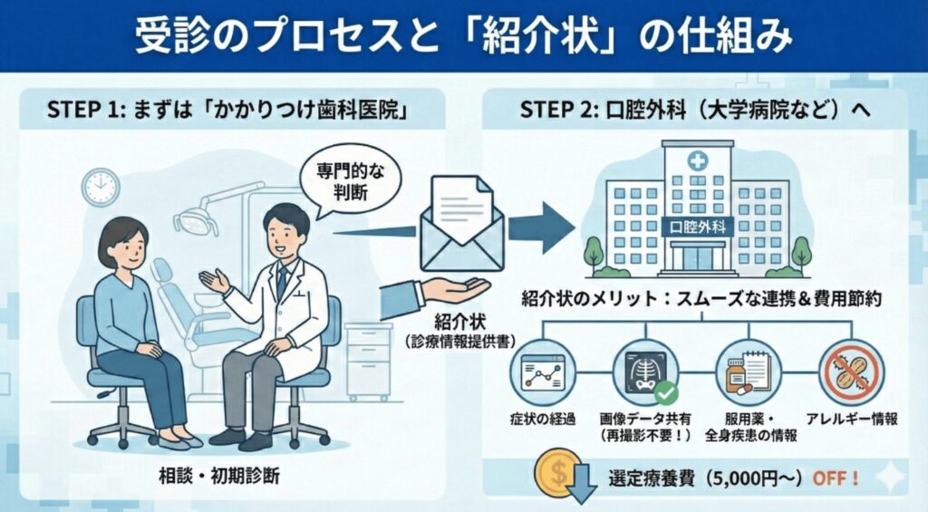 いきなり大きな大学病院の口腔外科を予約するのは、ハードルが高い場合もあります。まずは近所の歯科医院を受診し、「専門的な処置や精密検査が必要か」を判断してもらうのが最もスムーズな流れです。