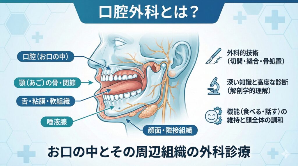 私たちが普段「歯医者さん」と聞いてイメージするのは、主に歯そのものの治療(虫歯や歯周病)ですが、口腔外科の領域はそれよりもはるかに広域です。歯だけでなく、顎の骨、頬の粘膜、舌、お口の中の軟組織(口腔粘膜)、さらには唾液を作る組織(唾液腺)や、それらに隣接する顔面全体の疾患を専門としています。