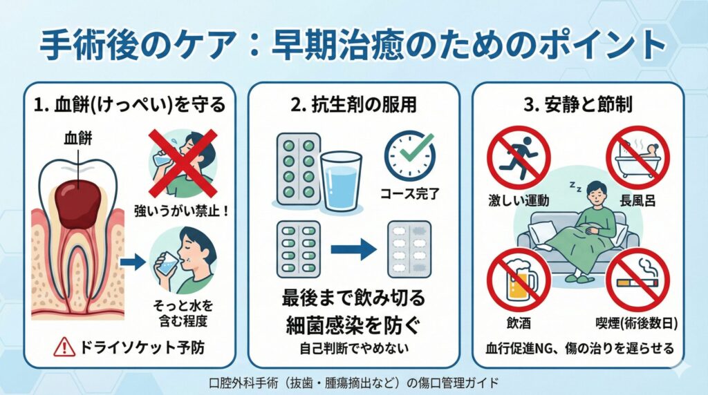 口腔外科の手術(抜歯や腫瘍摘出など)の後は、傷口の管理が非常に重要です。