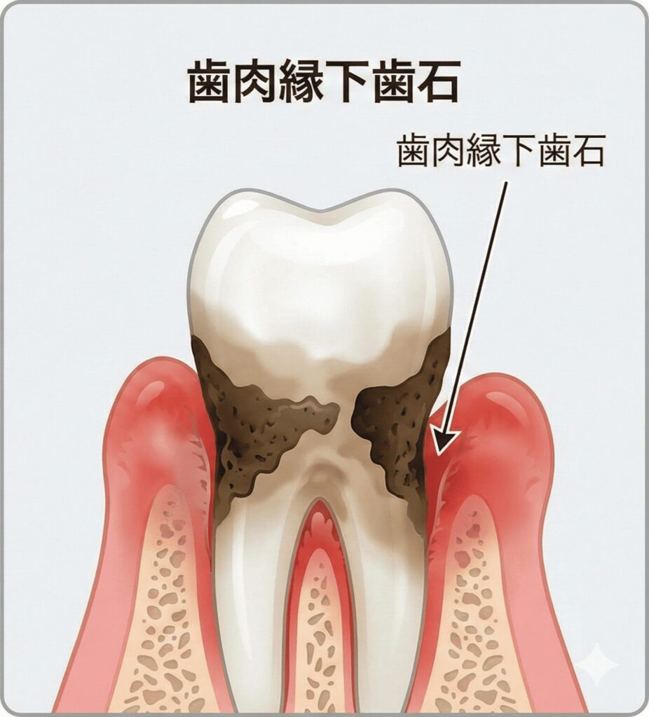 歯と歯茎の間の溝(歯周ポケット)の中にできる、非常に厄介な歯石です。