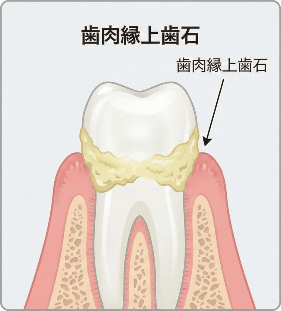 歯茎よりも上の、目に見える部分に付着する歯石です。唾液腺の開口部(唾液が出てくる穴)の近くにできやすいのが特徴です。