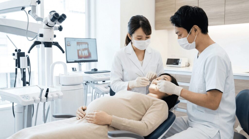 歯科医師が妊娠中であることを把握したうえで行う局所麻酔やレントゲン撮影は、お母さんと赤ちゃんへの影響を最小限に抑えるよう、十分な配慮のもとで実施されます。