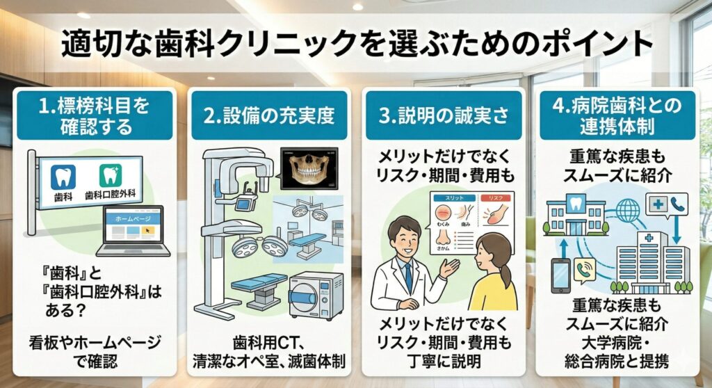 顎の骨の状態や神経の走行を3次元で確認できる「歯科用CT」があるか、外科手術に対応した清潔なオペ室や滅菌体制が整っているかは、口腔外科処置を受ける上で重要です。