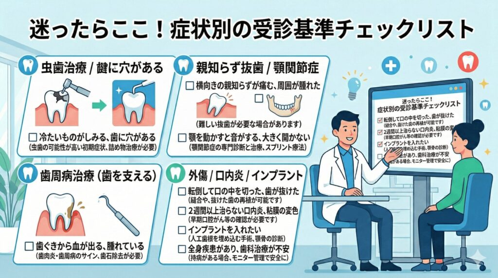 口腔外科が扱う疾患は、私たちが想像するよりもずっと広範囲です。以下に、口腔外科での受診が必要となる代表的な疾患と治療内容を詳しく見ていきましょう。