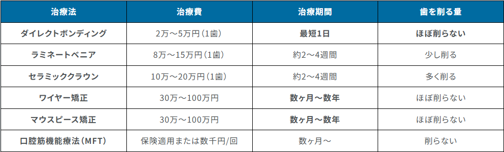 すきっ歯には複数の治療法が存在し、それぞれにメリット・デメリットがあります。