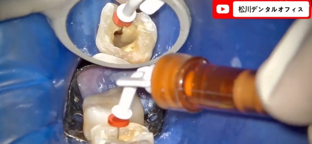 二回目の根管治療では、ラバーダムを装着して治療する歯を隔離し、マイクロスコープを使って根管内部の感染を除去していきます。