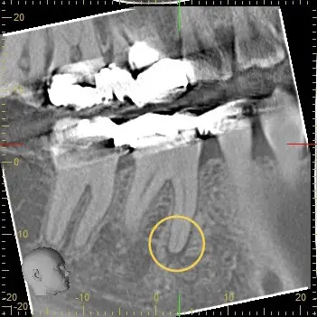 歯科用CTはレントゲン写真では見落としてしまうような部分(歯や根管が重なり合っているような部分)も多角的に撮影することが可能なので、隠れた根管や歯の根の先の膿(病巣)を見つけ出すのに役立ちます。