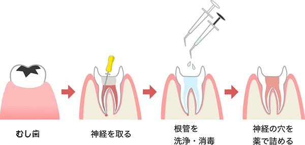 歯の神経が死んでしまっているなど機能回復が難しい場合、歯の神経や血管の集合組織である歯髄を取り除く処置を行います。